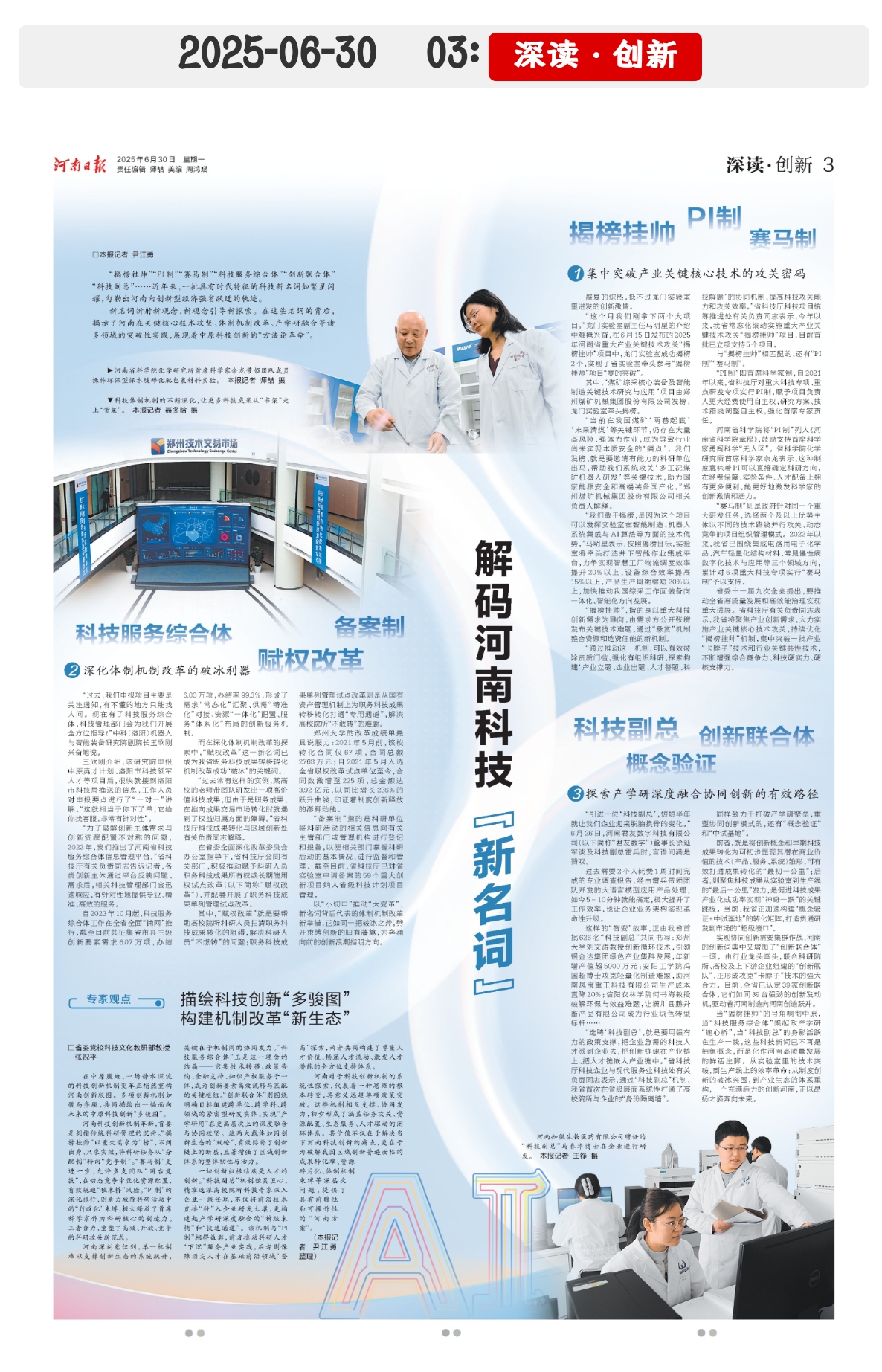 当“揭榜挂帅”的号角响彻中原,当“科技服务综合体”架起政产学研“连心桥”,当“科技副总”的身影活跃在生产一线,这些科技新词已不再是抽象概念,而是化作河南高质量发展的鲜活注脚。从实验室里的技术突破,到生产线上的效率革命;从制度创新的破冰突围,到产业生态的体系重构,一个充满活力的创新河南,正以昂扬之姿奔向未来。
