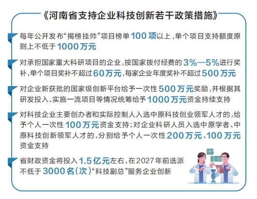 企业既是经济活动的主要参与者,又是技术进步的主要推动者。强化企业创新主体地位,是推动科技创新与产业创新深度融合、建设现代化产业体系的重要抓手和关键举措。8月4日,省政府印发《河南省支持企业科技创新若干政策措施》(以下简称《若干政策措施》),聚焦企业所需、政府所能,从8个方面提出一揽子共20条政策举措,用“真金白银”为企业创新提供强劲支撑。