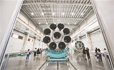 图为星际荣耀运载火箭总装总测复用工厂内设置的双曲线三号运载火箭机械模拟箭(109日摄)。