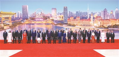 出席峰会的上海合作组织成员国、观察员国、对话伙伴国、主席国客人等20多位外国国家元首、政府首脑及配偶,联合国秘书长等10位国际组织负责人陆续抵达。礼兵列队致敬。伴随着各国名曲音乐,国际贵宾穿过由与会各国国旗、上海合作组织会旗和联合国旗帜组成的恢弘旗阵,沿着红地毯前行。