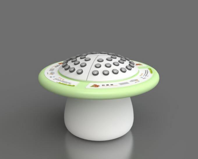 展项由按钮、数码管、按钮灯组成。展台表面均分为三个参与面 ,1-3人参与 均可。每个参与面均有一个开始键、一个数码管与若干个(不少于15个)蘑菇状按钮 灯。观众按下开始键 ,显示屏开始倒计时3秒 ,3秒内另一个参与面有人参与 ,即再次 开始等时3秒。等时最多不超过9秒。等时结束后游戏开始 ,蘑菇按钮灯随机亮起,观 众看到一个灯亮起 ,立刻去拍打它 ,拍中即记1分 ,数码管上给出动态的当前分值。