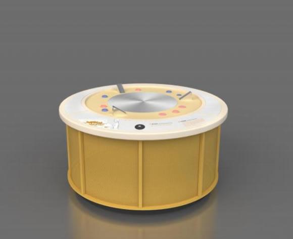 展项由转盘、圆环及圆盘等组成 ,展项中的圆盘在转动的转盘   中 ,受各种复合作用力的影响 ,包括 :重力、摩擦力、离心力等 ,展 现出不同的运动状态。有的会重心不稳 ,倒在转盘上被甩出去 ;有的 会在转盘上滚动 ,并沿着弧线滚出去 ;有的会在转盘上做相对静止的 旋转。观众按下“启动”按钮 ,转盘转动 ,将圆环、 圆盘或圆球沿倾 斜轨道放入到转盘中 ,可观看复合力对物体运动状态的影响。