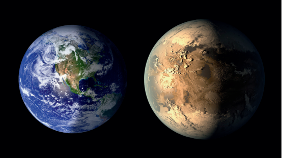 美国宇航局于2015年1月6日宣布确认发现开普勒438b,这是一颗和地球大小相近的系外行星,它距离地球470光年,直径是地球的1.12倍,表面温度约3℃,公转周期为35天,位于开普勒438这颗红矮星的宜居带内。不过这颗红矮星可能有着比太阳剧烈得多的恒星活动,以及更猛烈的耀斑和恒星风。这里或许也并不适合人类生存。图为开普勒438b(右)与地球的对比图像。