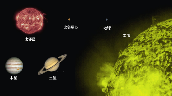 位于半人马座的南门二是距离我们最近的恒星系统,它由3颗恒星组成,距离我们约4.2光年。其中质量最小的一颗名为比邻星,它是一颗红矮星,质量和直径分别只有太阳的1/8和1/7。在这颗暗弱的恒星周围已经发现了3颗系外行星,其中比邻星b恰好位于比邻星的宜居带内,其质量和半径分别约是地球的1.2倍和1.3倍,它的公转轨道半径只相当于日地距离的1/20,每11.2天围绕比邻星公转一周,表面温度约-39℃。在距离我们最近的恒星旁边竟然就存在着一颗大小和地球相近,且位于宜居带内的系外行星,这无疑是令人兴奋的。不过以现有的技术,要想飞到这颗行星附近尚需要数十万年。图为比邻星及比邻星b与太阳系内部分天体大小对比。