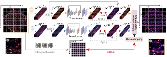 2025年11月24日,清华大学团队在Nature Communications上发表文章Leveraging spatial-angular redundancy for self-supervised denoising of 3D fluorescence imaging without temporal dependency。该研究针对这一尚未决解的难题,研发了基于光场空间角度冗余性的自监督去噪算法LF-denoising,能够在自然光级的激发光下实现高速长时程高保真的三维成像。LF-denoising通过双路网络结构,利用光场的空间角度上高维复合冗余特征进行自监督去噪训练,从而避免了单一冗余对于数据保真度的破坏。研究团队针对性地考虑了实际长时间活体观测场景中常见的固定模式噪声、快速样本活动等问题,使得LF-denoising能够被在常见的样本和多种显微设备上,突破低光强下复杂噪声的成像环境限制。团队在仿真测试和斑马鱼心跳、斑马鱼胚胎、小鼠肝脏、小鼠脑皮层、果蝇脑等多种模式生物的活体实验中,验证了LF-denoising高保真的去噪能力,并在国际上首次实现了自然光级光毒性(10-μW/mm2)的长时程亚细胞分辨率三维荧光显微成像。