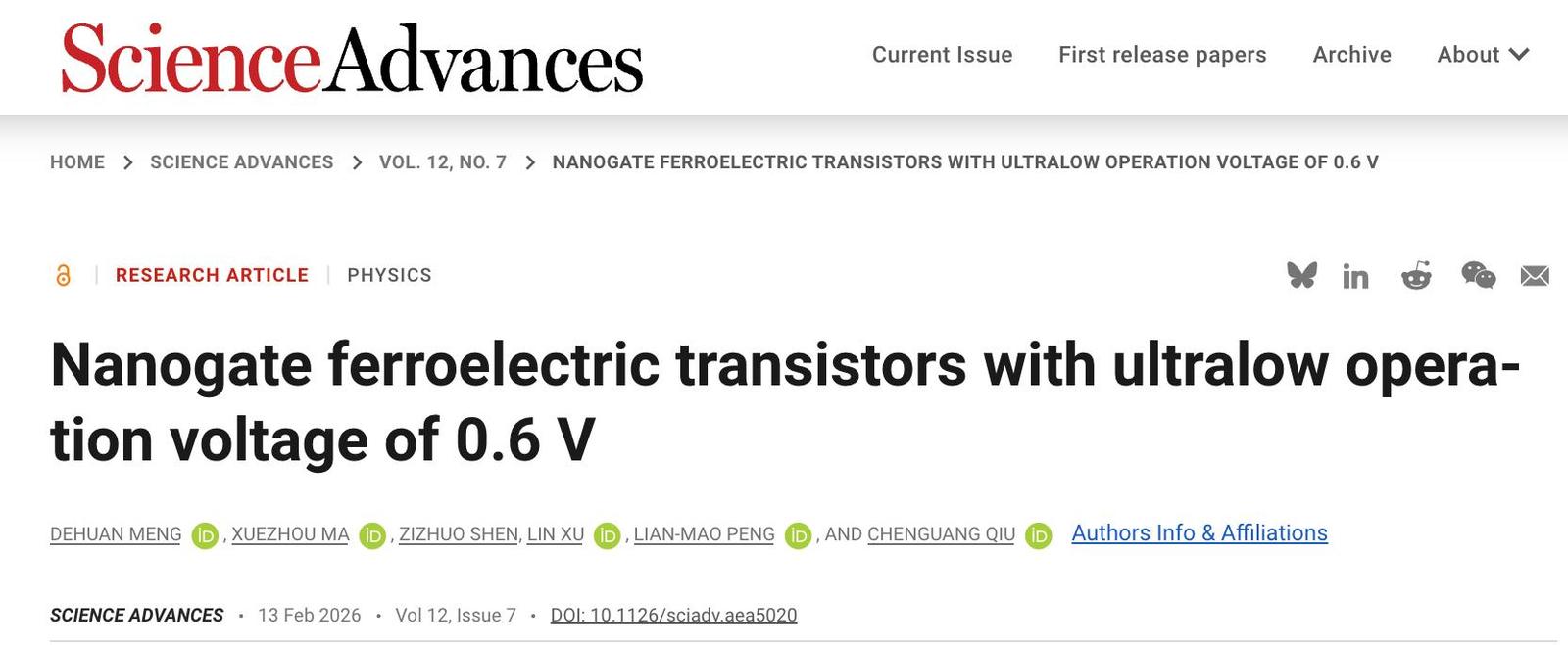 然而,传统铁电晶体管存在能耗过高、逻辑电压不匹配等短板限制了其大规模应用。为此,北京大学邱晨光研究员—彭练矛院士团队,利用纳米栅极结构设计,巧妙解决了铁电材料“改变极化状态”需要高电压高能耗的问题。