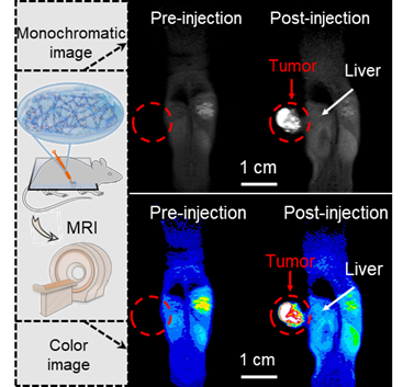 图3:注入肿瘤模型小鼠体内后,顺磁性水凝胶能显著增强肿瘤区域成像对比度,清晰显示肿瘤内部结构。