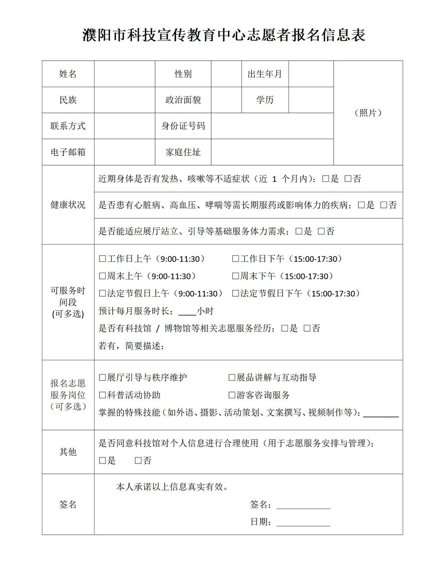 点击下载:濮阳市科技宣传教育中心志愿者报名信息表