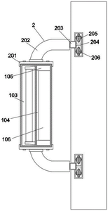 本实用新型涉及泳池氰尿酸持续去除技术领域,具体为一种具有持续结构的泳池氰尿酸的去除装置,包括:除氰尿酸结构、支撑结构和泳池体,所述除氰尿酸结构上下两侧用连接盖连接支撑结构前端,所述支撑结构后端的滑轮嵌入在泳池体内部的滑动槽中,通过后电池槽可以使卡槽卡住电池,使电池在框体被推动时不会晃动,通过前灯槽内的紫外线灯可以连接后电池槽内的电池,使紫外线灯照射出紫外线进行持续清除泳池内部的氰尿酸,通过滑轮在滑动槽内滑动,使滑轮带动着连接杆与支杆可以使支杆前端连接的连接盖被支杆带动,连接盖被支杆带动可以使连接盖能够带动着框体移动,出口是使支撑结构与除氰尿酸结构拿出来。