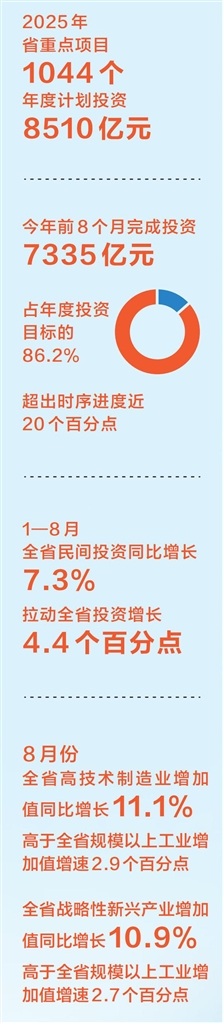快一点、再快一点。施工“进度条”拉满,意味着加速形成更多实物工作量。我省2025年省重点项目1044个,年度计划投资8510亿元。今年前8个月完成投资7335亿元,占年度投资目标的86.2%,超出时序进度近20个百分点。