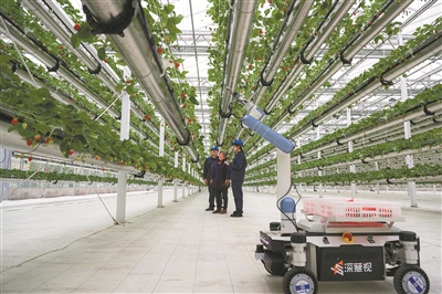 1月26日,在湖北宜昌一座智慧生态大棚内,搭载了视觉识别系统的采摘机器人成了采收鲜红饱满草莓的“好帮手”。系列科技成果的落地转化,不仅让草莓采收期延长至6个月,也让草莓亩产量高出传统种植模式4倍。为保障智慧农业生产用电稳定,国网宜昌供电公司工作人员主动上门,排查机器人传感器、智能调控中心等关键设备的供电线路故障。图为工作人员在检查设备。