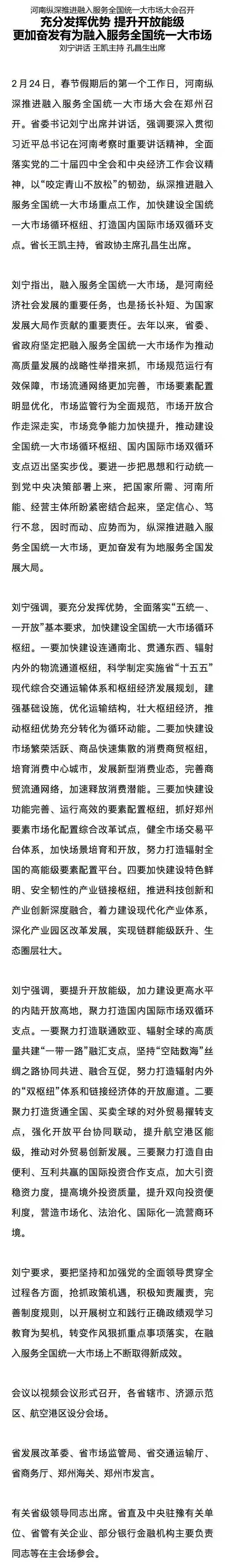 河南纵深推进融入服务全国统一大市场大会召开 刘宁讲话 王凯主持 孔昌生出席