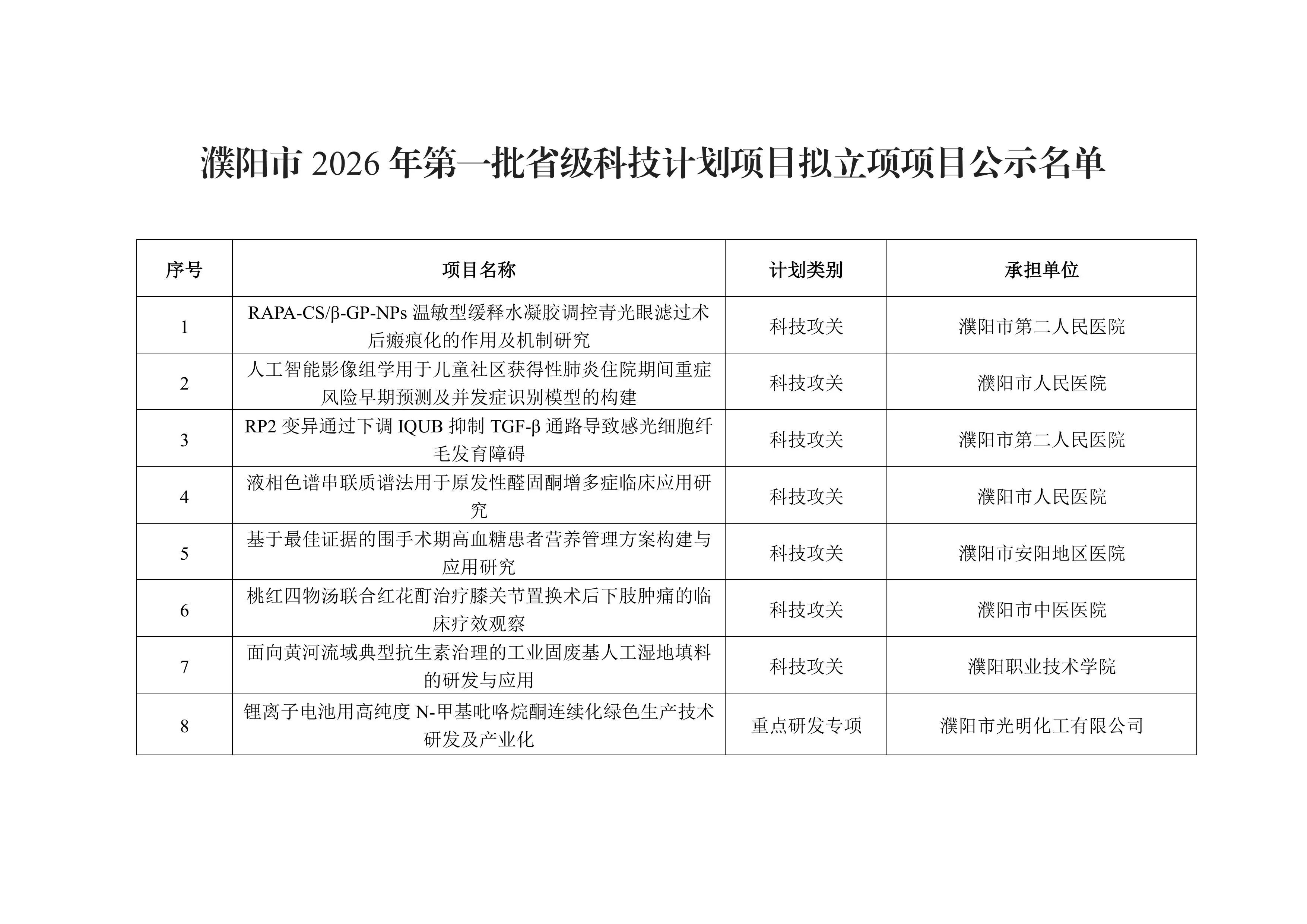 濮阳市2026年第一批省级科技计划项目拟立项项目公示名单