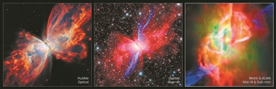 蝴蝶星云位于天蝎座,距离地球约3400光年。它属于“双极星云”,也就是说它有两个向相反方向展开的“气体叶片”,构成了蝴蝶的“翅膀”;而中间一条环状的致密尘带,则形成了蝴蝶的“身体”。
