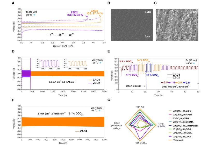 研究显示,在零下20摄氏度环境下,使用这一新型复合水系电解液,锌金属负极沉积/剥离具有97.7%的高初始库仑效率、长达5600小时的长循环寿命,以及高达50%的锌金属负极放电深度,且具有较小的过电位。