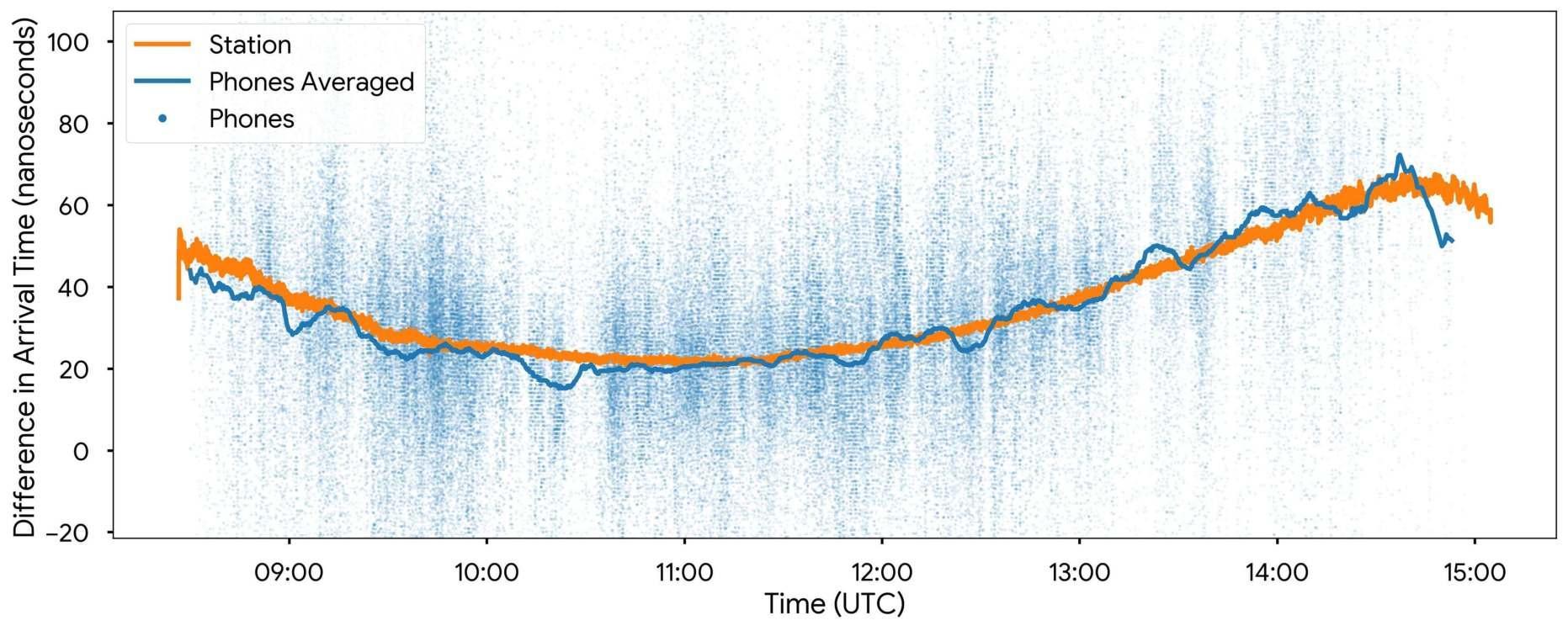 谷歌研究院的研究人员此次用数百万部安卓智能手机中的匿名测量数据,生成了电离层及其动态状况的地图,其覆盖面是传统地面接收器的两倍。有些安卓手机配备了双频GNSS接收器,能与较大的地面接收器进行相同的测量。