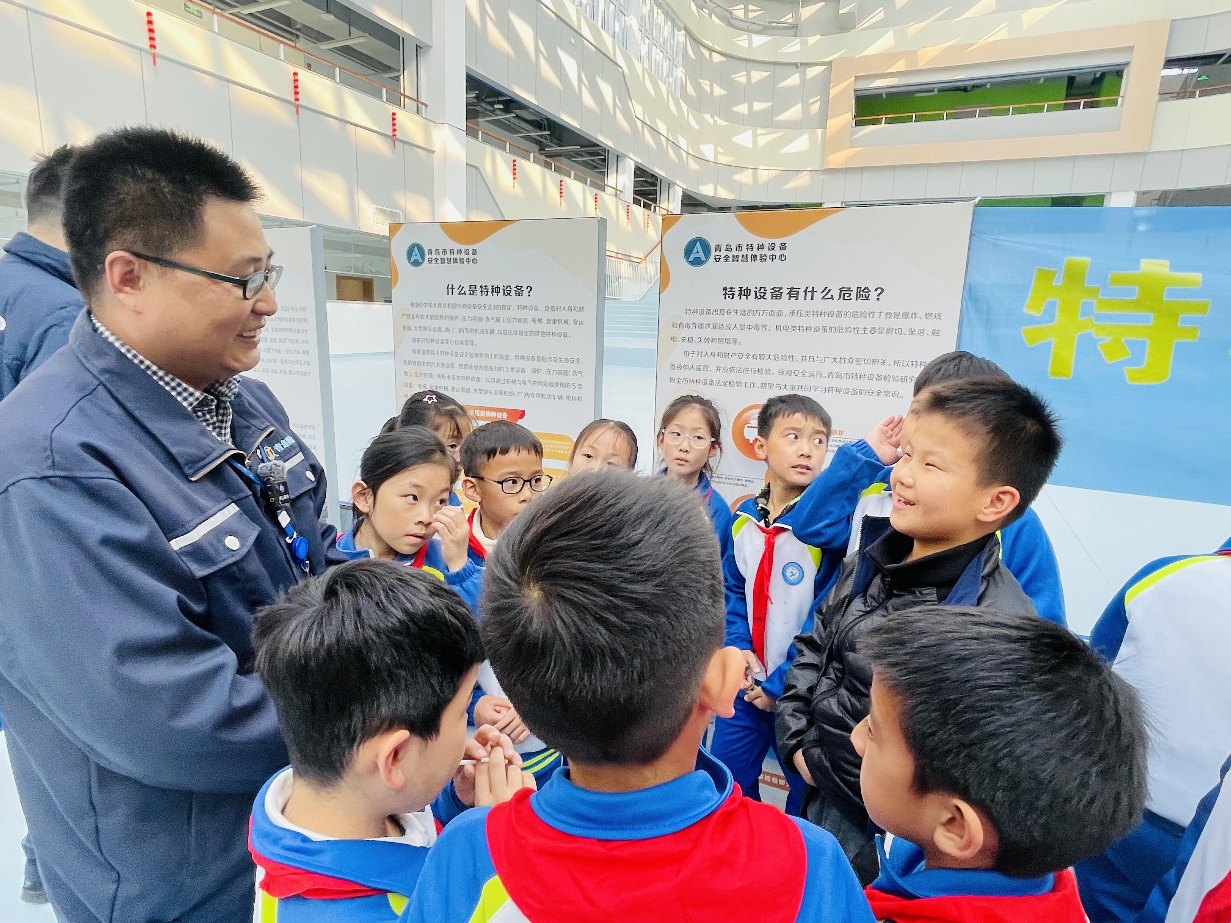 特种设备检验师为孩子们讲解特种设备知识。崂山区科协供图