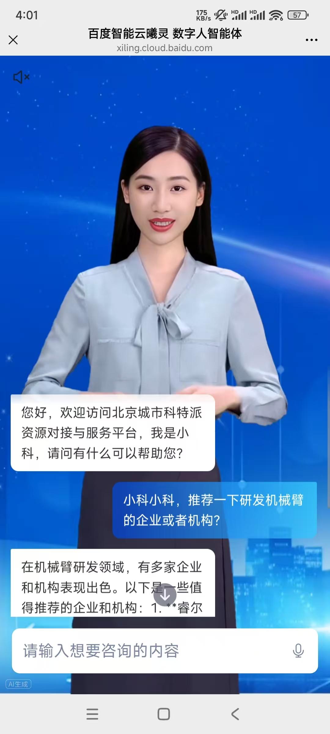 据悉,“小科”是北京城市科特派资源对接服务平台的科技资源对接手段之一。该平台依托首都科技条件平台、北京重点实验室和工程中心、北京科学技术研究院、北京市农林科学院、首都创新大联盟等单位和平台,汇聚了政策、人才、成果、机构、信息等资源11000余项,提供包括科技政策、人才对接、成果对接、机构对接、需求对接以及“科特派”直播间等方面的服务。并基于AI大模型及领域数据资源,构建了基于PC端和手机端应用的科特派数字人“小科”,为用户提供随时在线、多终端访问、7×24小时全天候服务的资源对接,全方位服务于北京城市科技创新与管理。