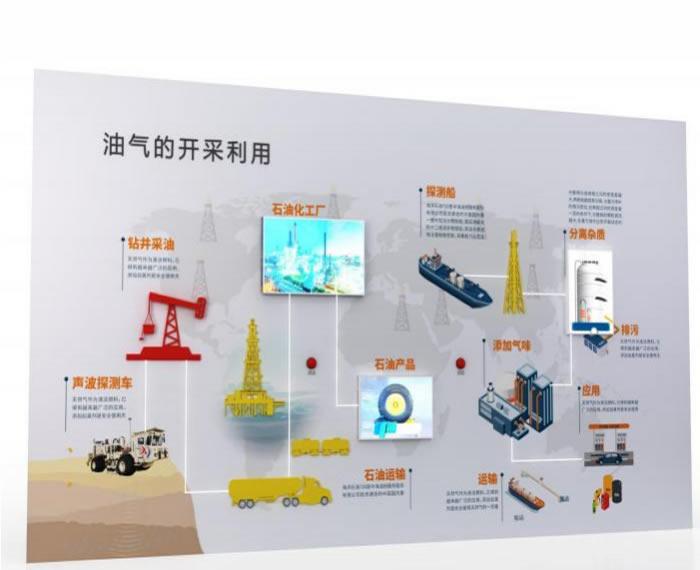 油气的开采、冶炼、利用的流程图组成的模型立在墙面上, 由互动模块、灯带、灯箱等组成,观众通过互动装置,观看石油、天然气是如何被开采、利用的。