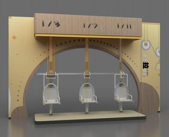 观众分别坐上不同座椅 ,自己拉动提升自己 ,感受不同的拉力 ,从而比较出三个滑轮组的费力大小。通过实验可以发现 , 动滑轮使用的个数越多 ,则使用的力气越小 ,同时绳索拉出的 长度就越长。