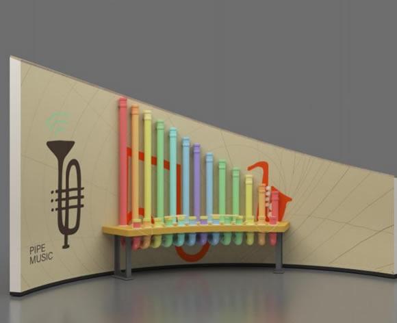 展项由粗细相同、长短不一的弯曲管道组成,每根管道会 发出不同音调。台面上设置乐谱和手拍片。