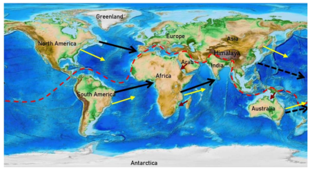 早期地球的角动量交换主要发生在地核与岩浆圈层之间。当岩浆圈层相对地核向东运动时,地球自转偏向力的作用使得北半球岩浆向东南流动和南半球岩浆向东北流动。这种岩浆从下方的水平运动驱动了中高纬度和两极的较厚地壳分裂成大小不等的板块:北半球板块向东南漂移,南半球板块向东北漂移 [1],形成一条在赤道附近弯曲的辐合带,使得两侧大陆面积相等 [2](附图)。