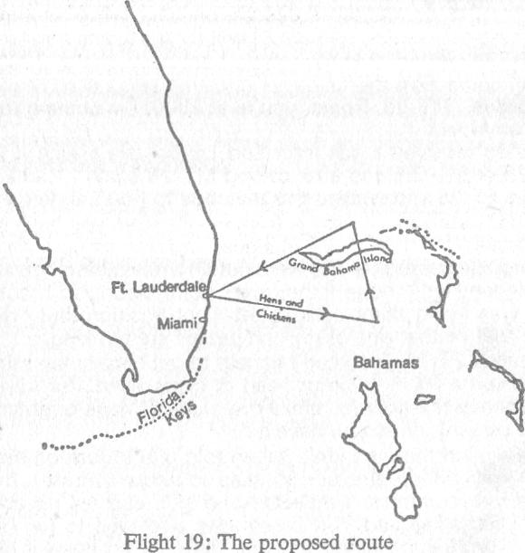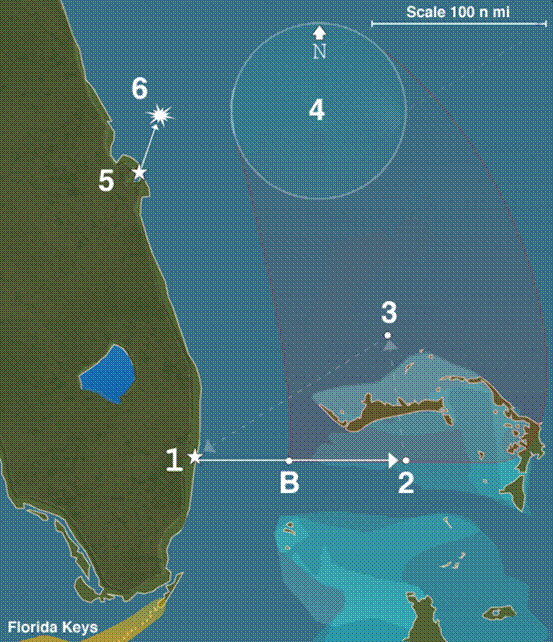 19飞行中队事故区域。标识1-3:原定演习路线;标识4:中队偏航后无线电探测到的最后位置;标识5-6:马丁PBM-5“水手”救援机起飞与爆炸位置(图源:Wikipedia