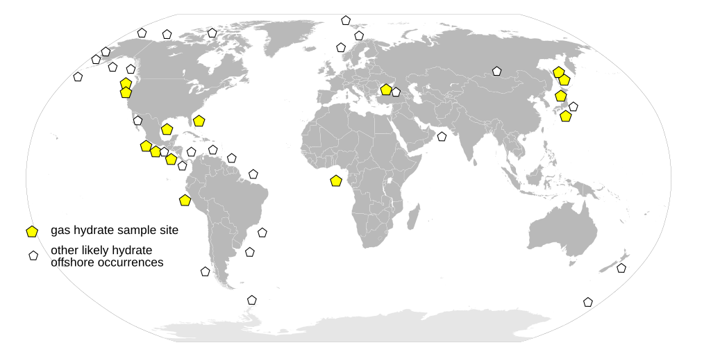 1996 年,科学家已在多处近海发现或推测存在甲烷水合物沉积(图源:USGS