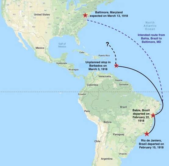 “独眼巨人号”原定路线与失踪地点(图源:U.S. Naval Institute