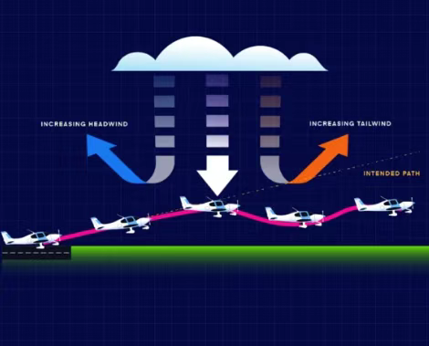风切变指的是风速或风向在不同高度或位置上发生突变,当风速达到一定强度时,便会使风向的角度发生,突如其来的风速方向改变让飞机仿佛被“推了一把”,从而产生颠簸。