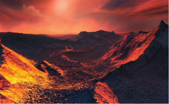 巴纳德星是一颗质量较小的红矮星,位于蛇夫座,距离我们约6光年,是距离我们第二近的恒星系统,也是从地球上观测自行最快的恒星。2018年底,在它旁边发现了一颗系外行星——巴纳德星b,这是一颗超级地球,质量至少是地球的3.2倍以上,公转轨道半径约是日地距离的2/5。由于巴纳德星的发光能力远远弱于太阳,所以在巴纳德b表面只会被暗红色的光芒所笼罩,它的表面温度约在-170℃,是一颗冰冻的行星。图为巴纳德星b地表的艺术想象图。