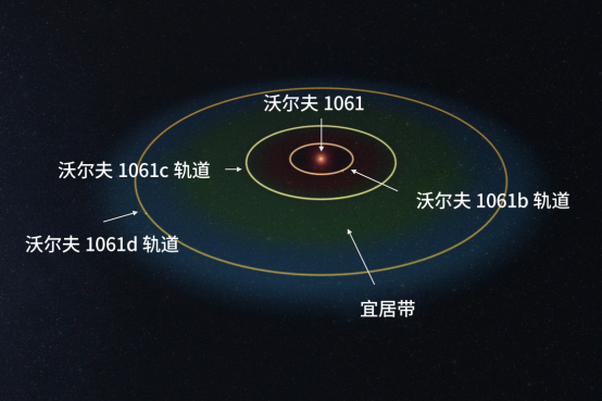 沃尔夫1061位于蛇夫座,距离我们约14.1光年,是一颗质量和半径都只有太阳0.3倍左右的红矮星,表面温度为3070℃。2015年,澳大利亚新南威尔士大学发现了3颗围绕它公转的系外行星——沃尔夫1061b、c、d,3颗行星的质量分别是地球的1.9倍、3.4倍和7.7倍,公转周期分别是4.9天、17.9天和217天。其中沃尔夫1061c位于该恒星宜居带的内侧边缘(如图所示),这也使它成为了宜居行星的候选者之一。