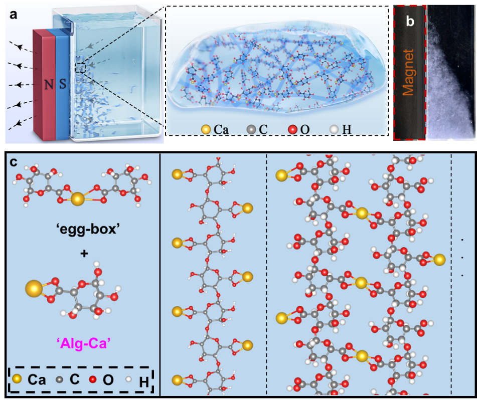 图1:(a)超强顺磁性海藻酸-钙水凝胶示意图;(b)水凝胶被磁铁吸引;(c)无净磁矩的经典“蛋盒”结构和具有净磁矩的“Alg-Ca”单元结构。