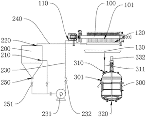 本实用新型公开了一种DM废料处理设备,涉及化工废水处理技术领域。DM废料处理设备包括压滤装置、储水罐、反应釜;压滤装置包括由滤板与滤框组成的过滤室,过滤室内用于放置DM废料,压滤装置上设有进水口、出水口;储水罐上设有第一排水口、回水口,第一排水口与进水口通过进水管连通,回水口与出水口通过出水管连通;反应釜内设有反应腔,反应釜具有与反应腔连通的进料口、排料口;本实用新型提供的DM废料处理设备,通过先利用水流先对DM废料进行循环冲洗,对DM废料的酸碱度进行调节,再将DM废料输入反应釜中进行加热裂解,从而将其转换为树脂材料,从而实现危废物料的再利用,减少对环境的污染。