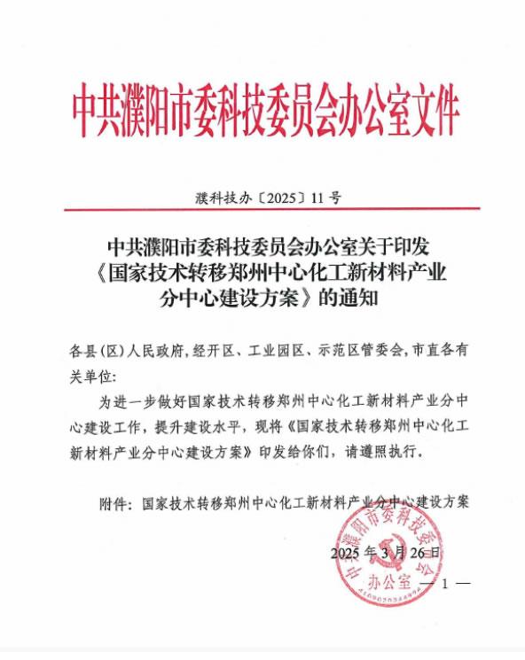 《建设方案》明确了国家技术转移郑州中心化工新材料产业分中心建设的总体要求、重点任务和保障措施,着力促进化工新材料产业提档升级,提升区域创新和成果转化引领带动作用。